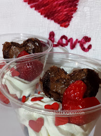 All I did is cut up strawberries and blueberries, add some to the bottom of the clear cup, top with cool whip (i piped it with a bag, but it not necessary) and add a heart shaped brownie and strawberry.